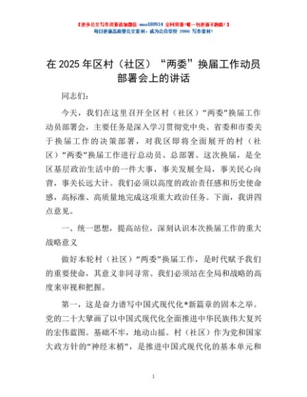 / 在2025年区村(社区)“两委”换届工作动员部署会上的讲话