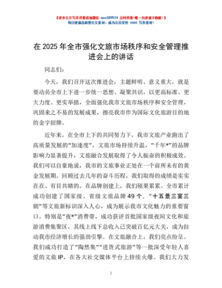 / 在2025年全市强化文旅市场秩序和安全管理推进会上的讲话