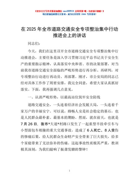 / 在2025年全市道路交通安全专项整治集中行动推进会上的讲话