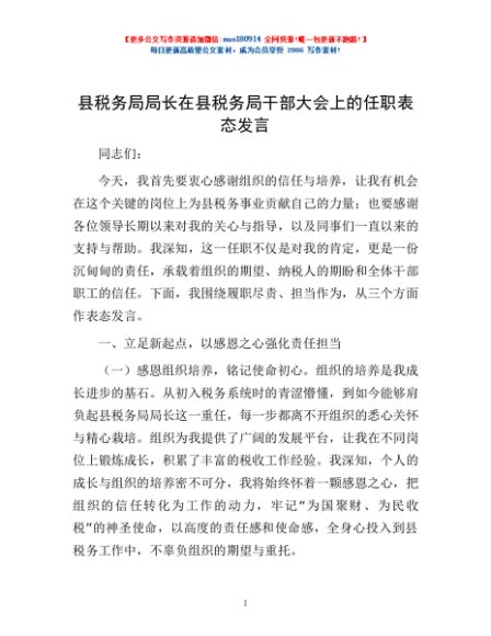 / 县税务局局长在县税务局干部大会上的任职表态发言