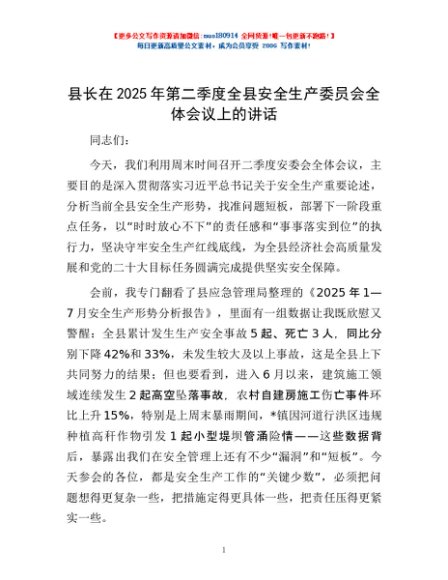 / 县长在2025年第二季度全县安全生产委员会全体会议上的讲话
