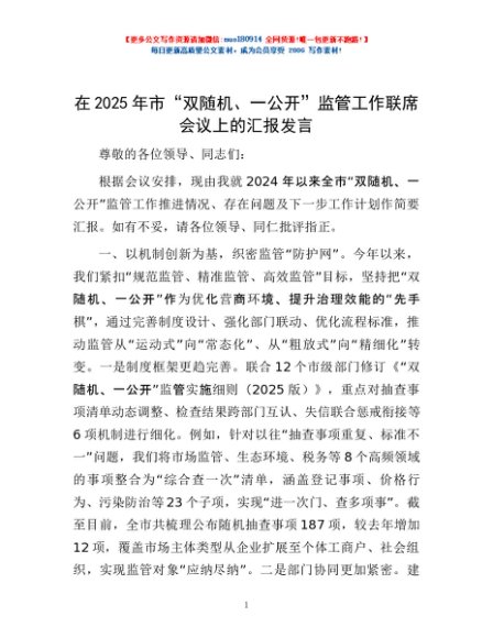 / 在2025年市“双随机、一公开”监管工作联席会议上的汇报发言