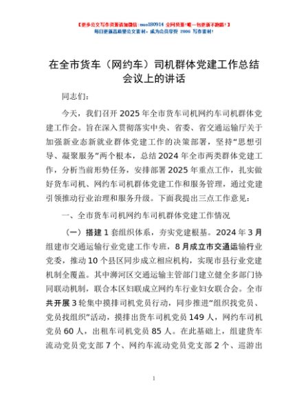 / 在全市货车(网约车)司机群体党建工作总结会议上的讲话