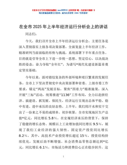 / 在全市2025年上半年经济运行分析会上的讲话