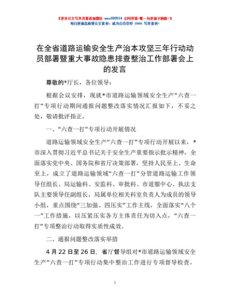 / 在全省道路运输安全生产治本攻坚三年行动动员部署暨重大事故隐患排查整治工作部署会上的发言