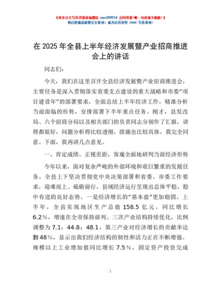 / 在2025年全县上半年经济发展暨产业招商推进会上的讲话