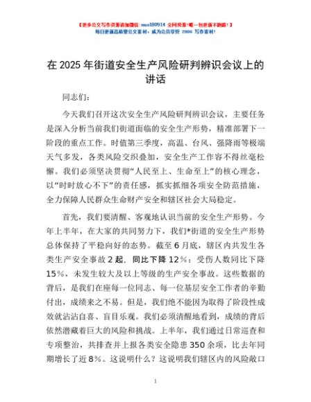 / 在2025年街道安全生产风险研判辨识会议上的讲话