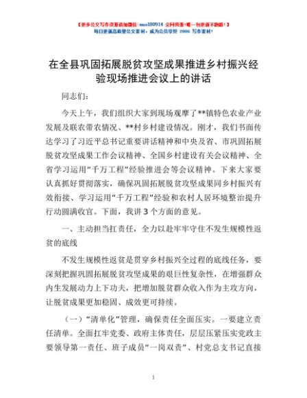 / 在全县巩固拓展脱贫攻坚成果推进乡村振兴经验现场推进会议上的讲话