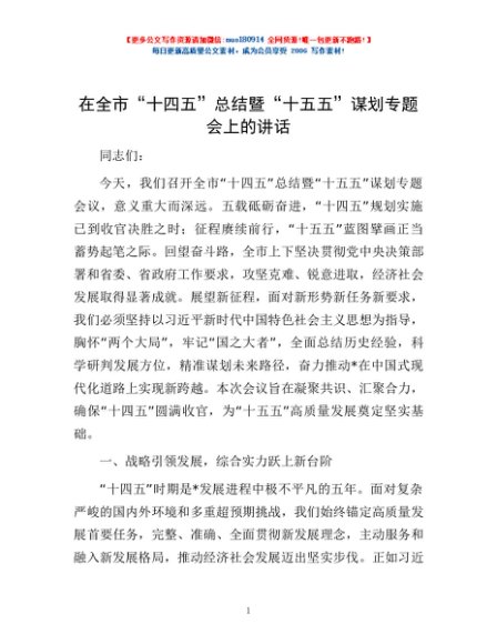 / 在全市“十四五”总结暨“十五五”谋划专题会上的讲话