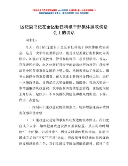 / 区纪委书记在全区新任科级干部集体廉政谈话会上的讲话