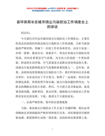 / 县环保局长在城市扬尘污染防治工作调度会上的讲话