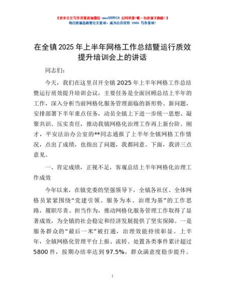 / 在全镇2025年上半年网格工作总结暨运行质效提升培训会上的讲话
