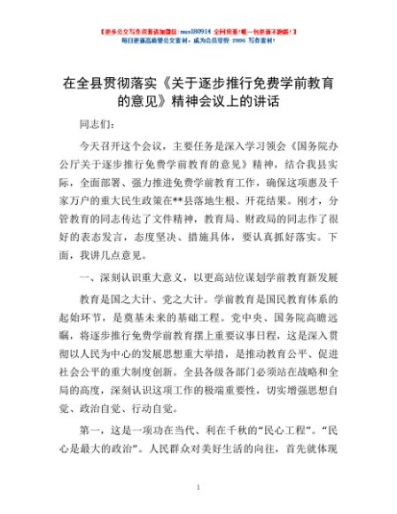/ 在全县贯彻落实《关于逐步推行免费学前教育的意见》精神会议上的讲话