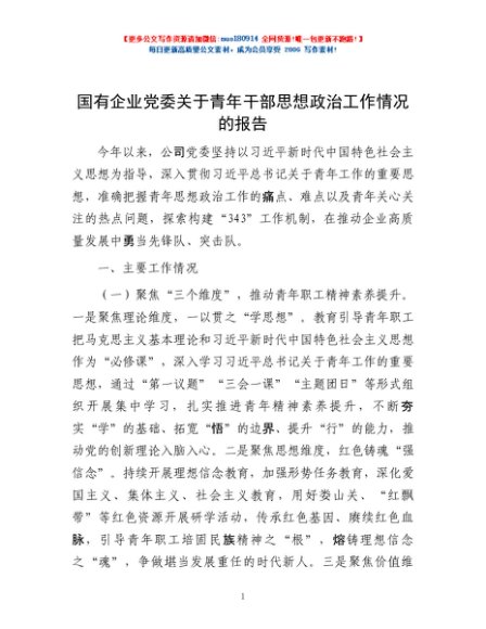 / 国有企业党委关于青年干部思想政治工作情况的报告