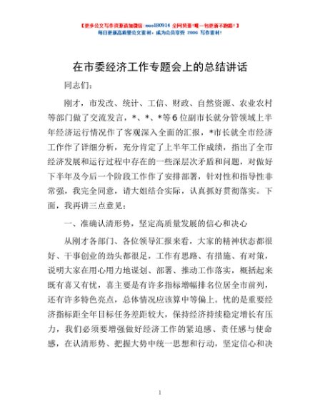 / 在市委经济工作专题会上的总结讲话