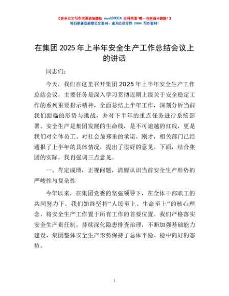 / 在集团2025年上半年安全生产工作总结会议上的讲话