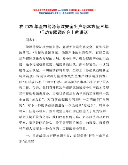 / 在2025年全市能源领域安全生产治本攻坚三年行动专题调度会上的讲话