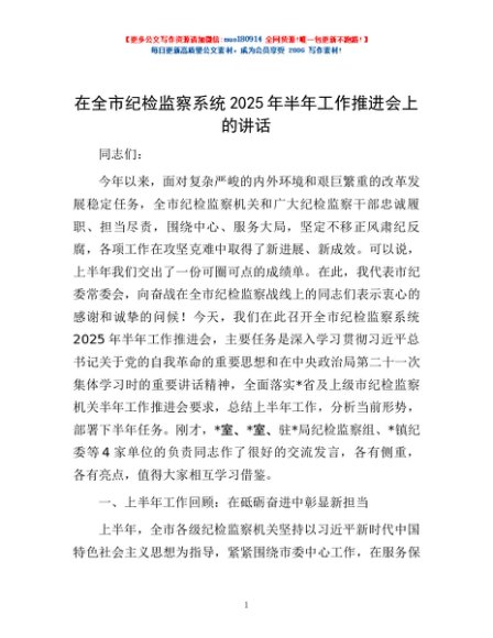 / 在全市纪检监察系统2025年半年工作推进会上的讲话