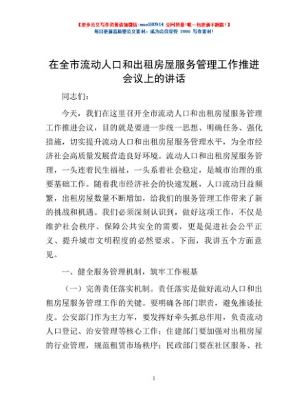 / 在全市流动人口和出租房屋服务管理工作推进会议上的讲话