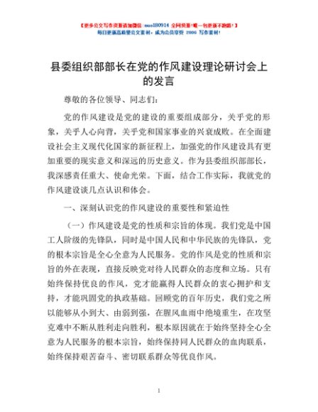 / 县委组织部部长在党的作风建设理论研讨会上的发言