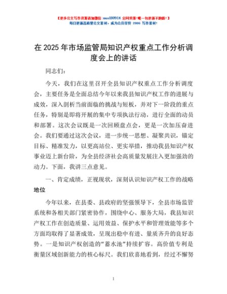 / 在2025年市场监管局知识产权重点工作分析调度会上的讲话
