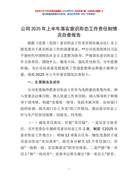 / 公司2025年上半年落实意识形态工作责任制情况自查报告