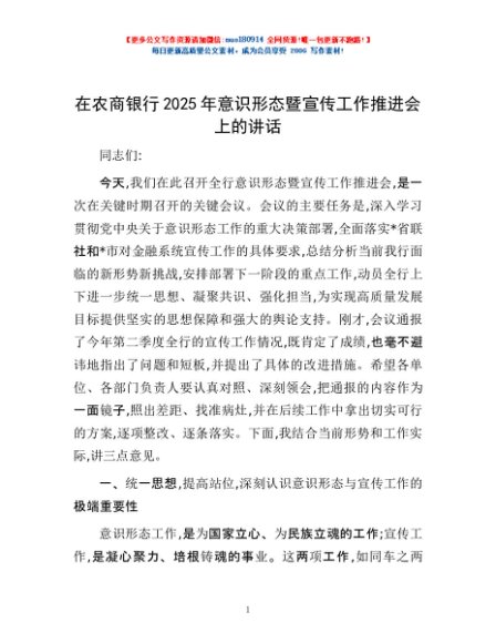 / 在农商银行2025年意识形态暨宣传工作推进会上的讲话