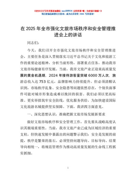 / 在2025年全市强化文旅市场秩序和安全管理推进会上的讲话