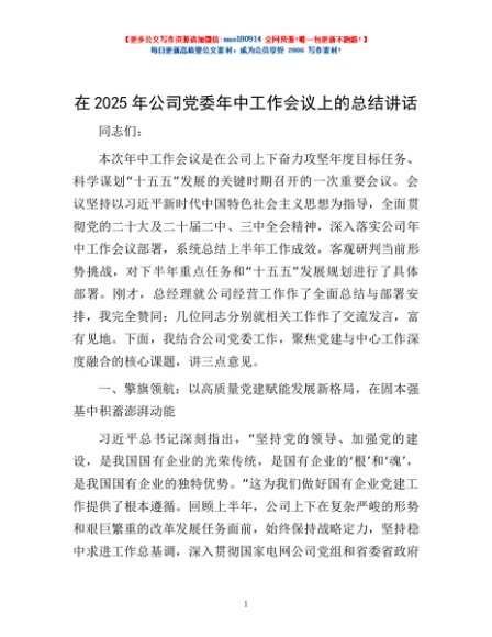 / 在2025年公司党委年中工作会议上的总结讲话