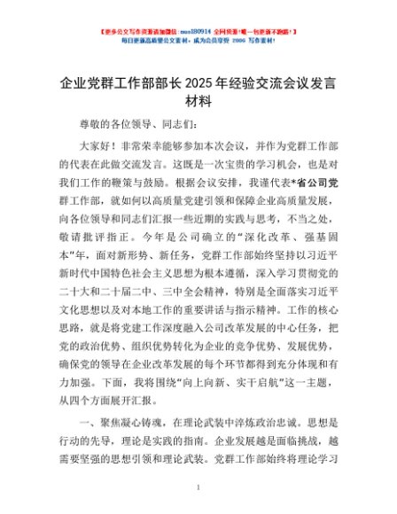 / 企业党群工作部部长2025年经验交流会议发言材料