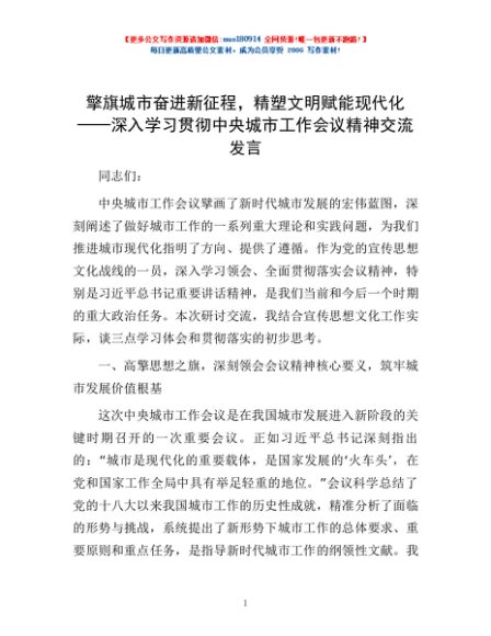 / 擎旗城市奋进新征程,精塑文明赋能现代化——深入学习贯彻中央城市工作会议精神交流发言
