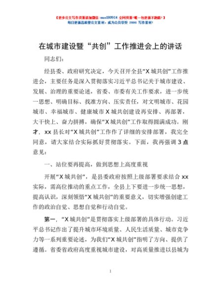 / 在城市建设暨“共创”工作推进会上的讲话