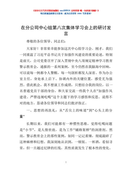 / 在分公司中心组第八次集体学习会上的研讨发言