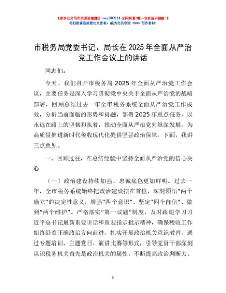 / 市税务局党委书记、局长在2025年全面从严治党工作会议上的讲话