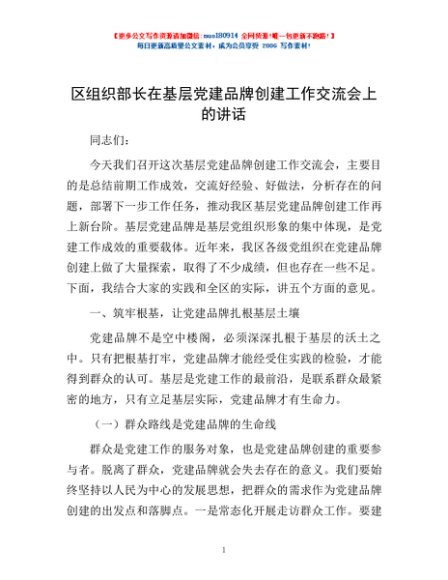 / 区组织部长在基层党建品牌创建工作交流会上的讲话