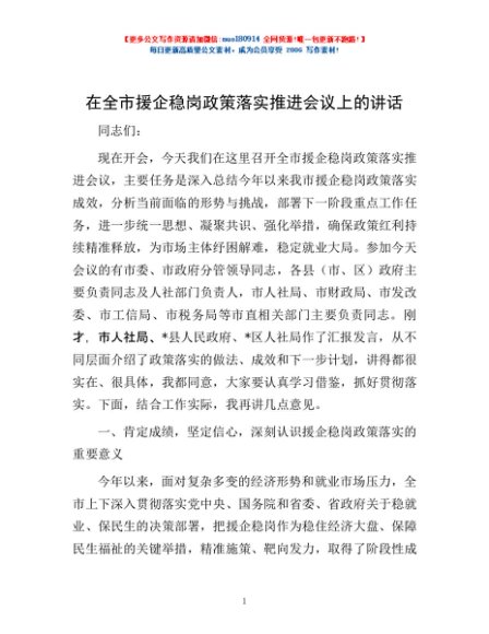 / 在全市援企稳岗政策落实推进会议上的讲话