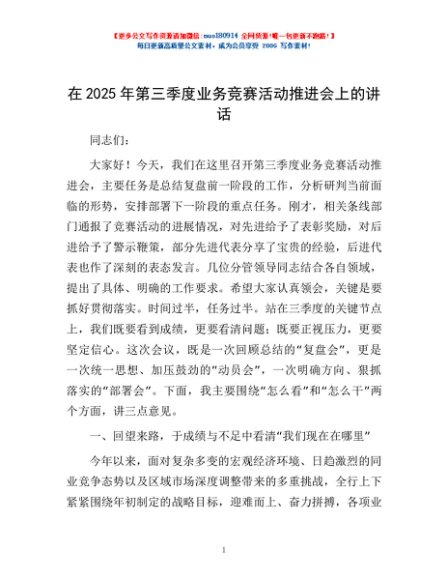 / 在2025年第三季度业务竞赛活动推进会上的讲话