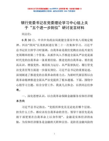 / 银行党委书记在党委理论学习中心组上关于“五个进一步到位”研讨发言材料