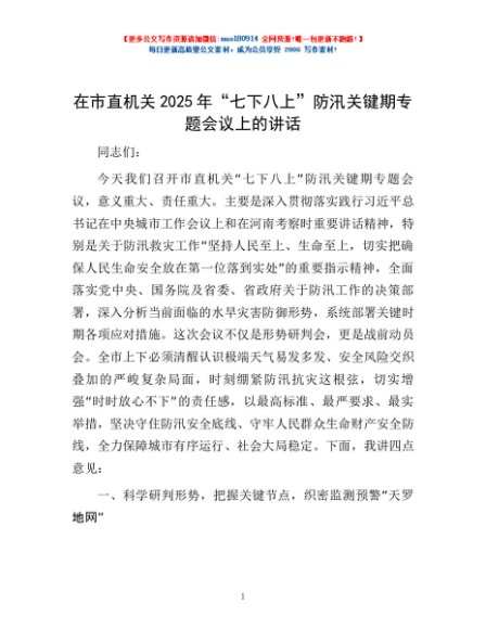 / 在市直机关2025年“七下八上”防汛关键期专题会议上的讲话