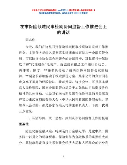 / 在市保险领域民事检察协同监督工作推进会上的讲话