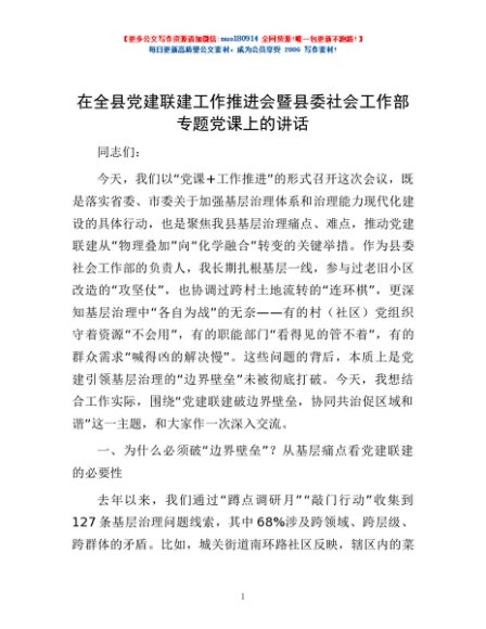 / 在全县党建联建工作推进会暨县委社会工作部专题党课上的讲话