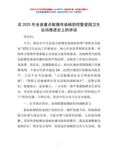 / 在2025年全县重点蚊媒传染病防控暨爱国卫生运动推进会上的讲话