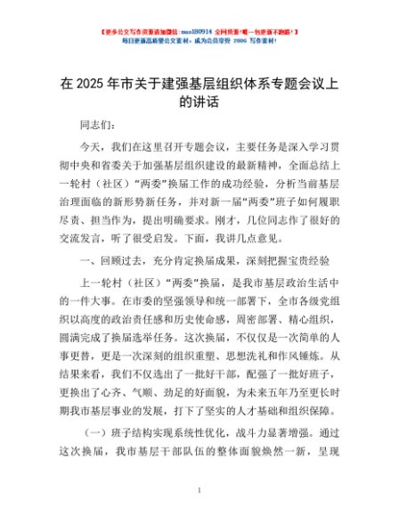 / 在2025年市关于建强基层组织体系专题会议上的讲话
