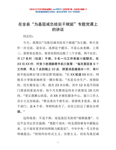 / 在全县“为基层减负 给实干赋能”专题党课上的讲话