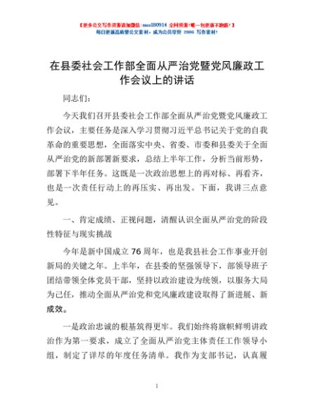 / 在县委社会工作部全面从严治党暨党风廉政工作会议上的讲话