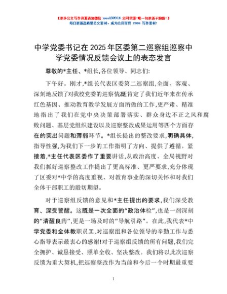 / 中学党委书记在2025年区委第二巡察组巡察中学党委情况反馈会议上的表态发言