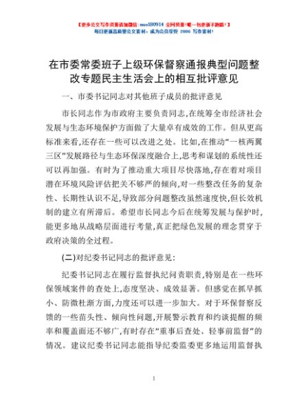 / 在市委常委班子上级环保督察通报典型问题整改专题民主生活会上的相互批评意见