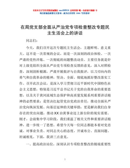 / 在局党支部全面从严治党专项检查整改专题民主生活会上的讲话