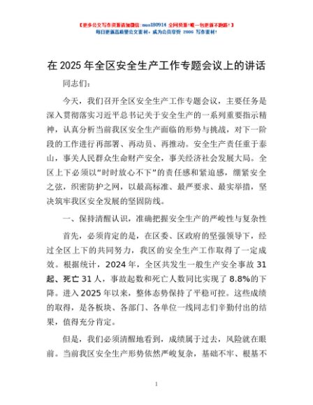 / 在2025年全区安全生产工作专题会议上的讲话