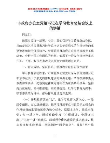 / 市政府办公室党组书记在学习教育总结会议上的讲话